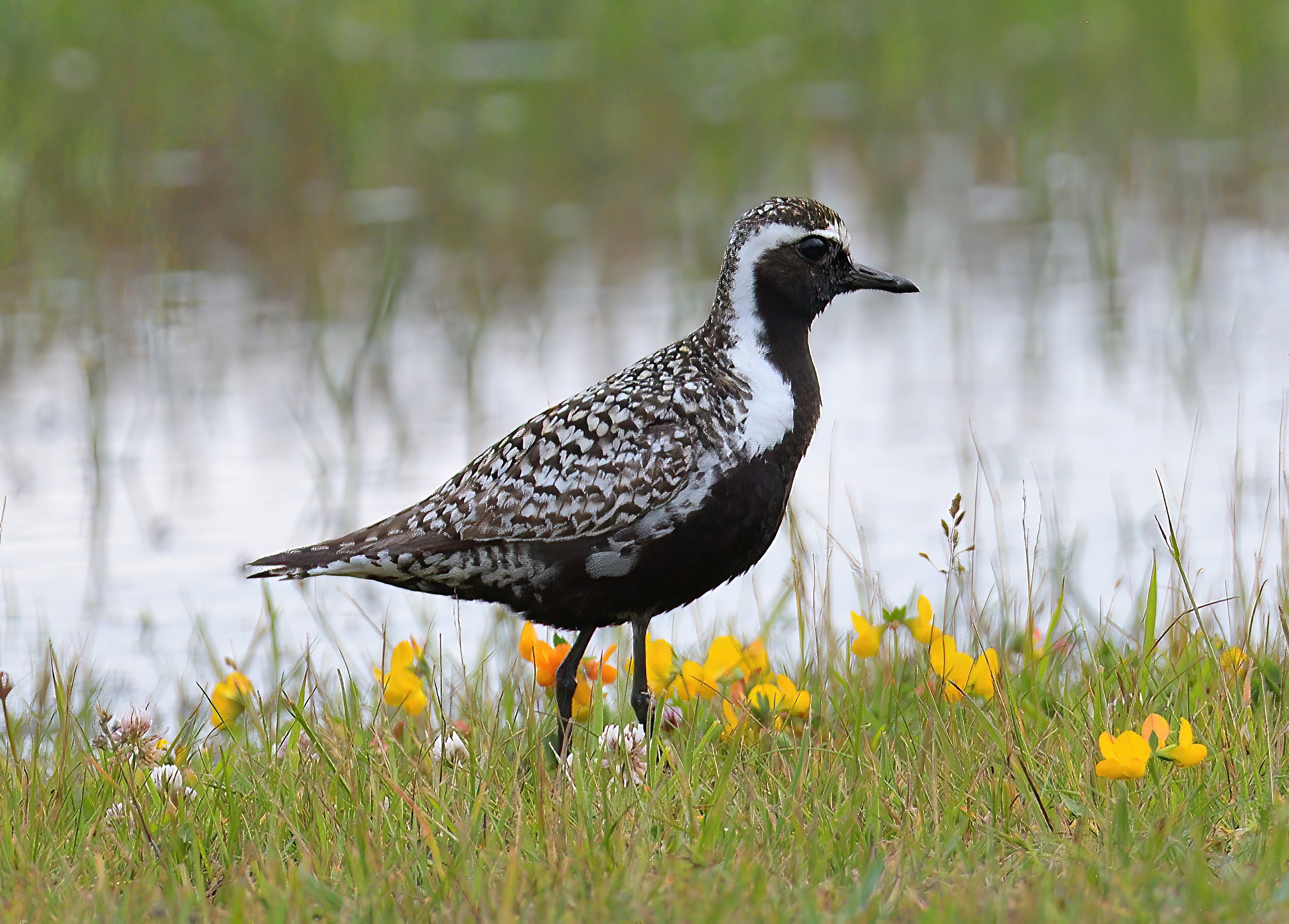 Adult male American Golden Plovers in summer plumage are even more dramatically marked than European birds. The upperparts are spangled very bright gold. The face and the whole of the underparts (including the flanks and undertail coverts) are solidly black and the white lateral line is broad, bulging at the breast-sides and almost meeting across the centre. Note, however, that females, first-summer birds and birds in body moult will all show a paler and more disrupted pattern.