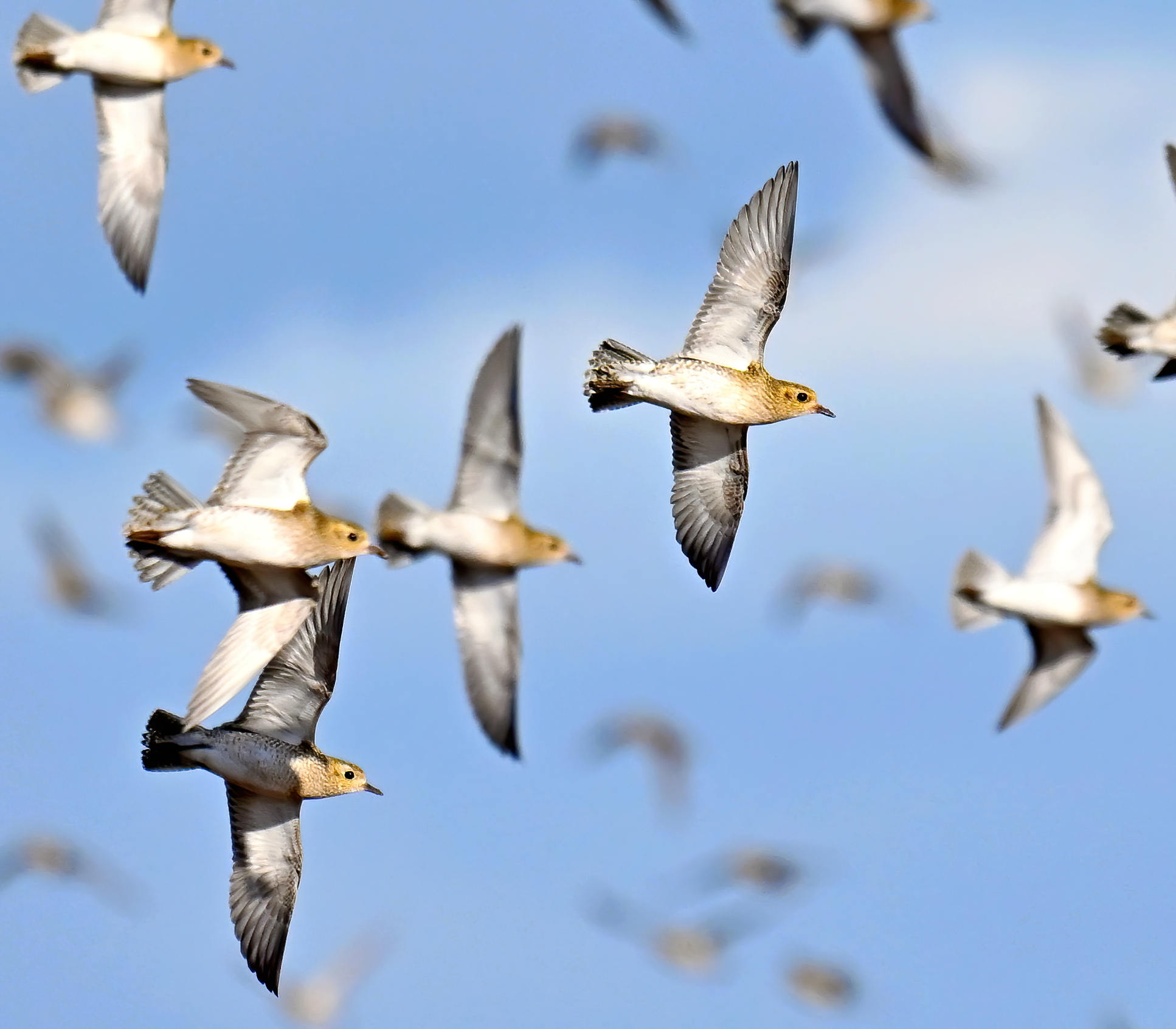 European Golden Plovers (Texel, The Netherlands, 19 September 2008). A large flock of European Golden Plovers is always a wonderful sight. The summer-plumaged birds here catch the eye but the repeated pattern of gold-spangled upperparts is always a delight as well. The tight flocking and constant alertness are typical of the species (Will Leurs / www.agami.nl).